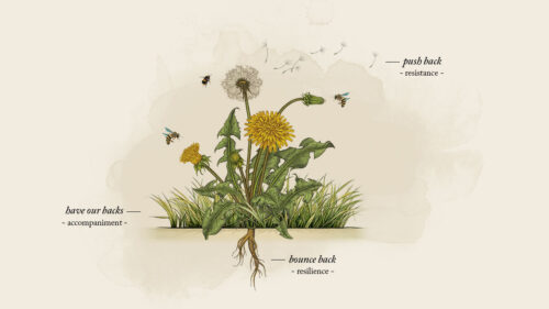 The below and beyond of well-being requires integrity of presence in our relationships and our efforts to transform systemic harm. We continuously learn from our teachers, friends, and more-than-human kin that this quality of presence emerges from a deep commitment to recognize and embody the relationship between resilience, resistance, and accompaniment.